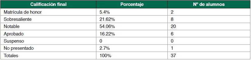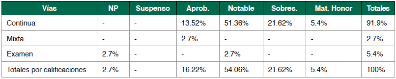 Las calificaciones finales del alumnado de este curso son bastante buenas, sólo hay un 2.7% que no ha superado la asignatura porque no se ha presentado al examen. El resto de los alumnos han superado la asignatura con calificaciones bastante altas. La nota media de la asignatura es de 7.72 puntos sobre 10. En la tabla 6 se recogen los porcentajes de cada calificación según la vía de aprendizaje y evaluación elegida por los alumnos.