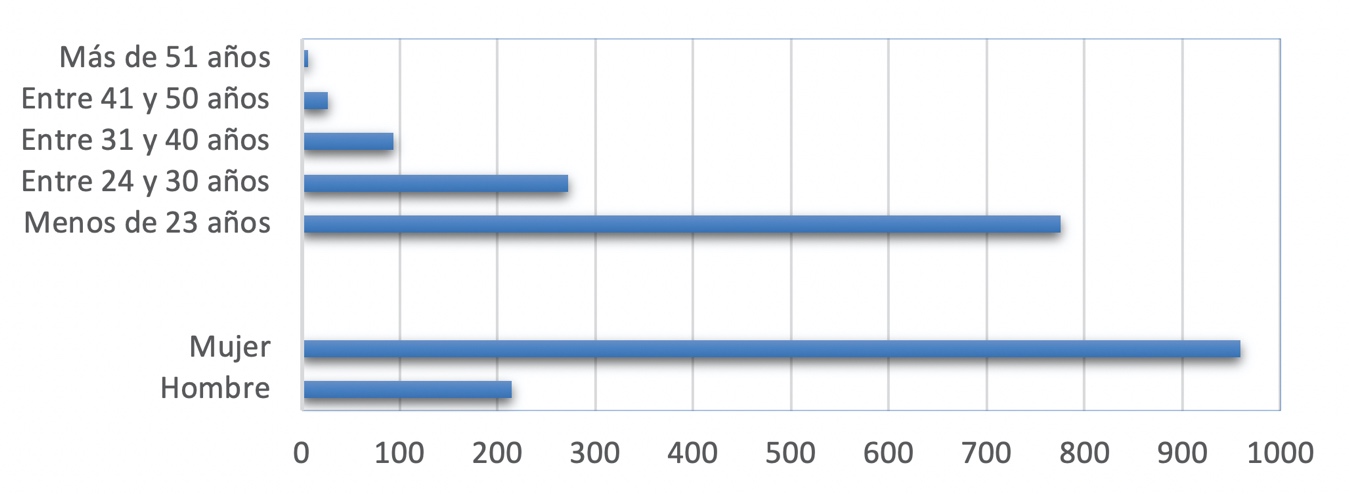 Tal y como puede observarse en el gráfico 1, participaron 959 mujeres y 214 hombres, siendo en su mayoría (66%) menores de 23 años. Estuvieron representados todos los cursos de la formación universitaria, en las titulaciones de grado en Magisterio en Educación Primaria (36,4%), Infantil (23,4%), Pedagogía (13,2%), Educación Social (11,2%), Infantil y Primaria (3,8%) y también en varios tipos de máster (11,9%). Contestaron al cuestionario más de la mitad de las universidades españolas, destacando las respuestas de las universidades del este peninsular, ya que entre las universidades de la Comunidad Valenciana y Cataluña sumaron el 40% del total.