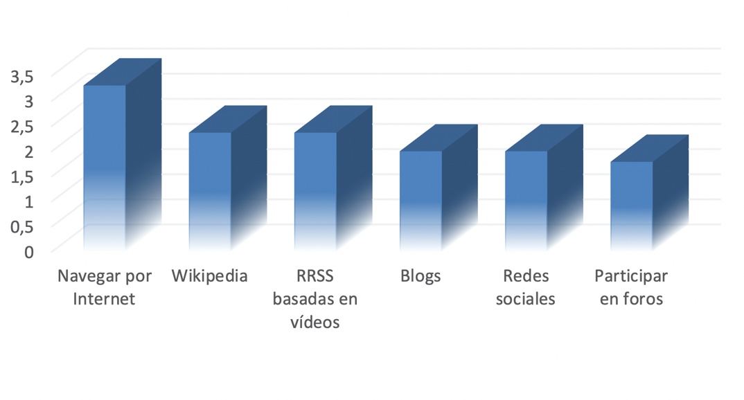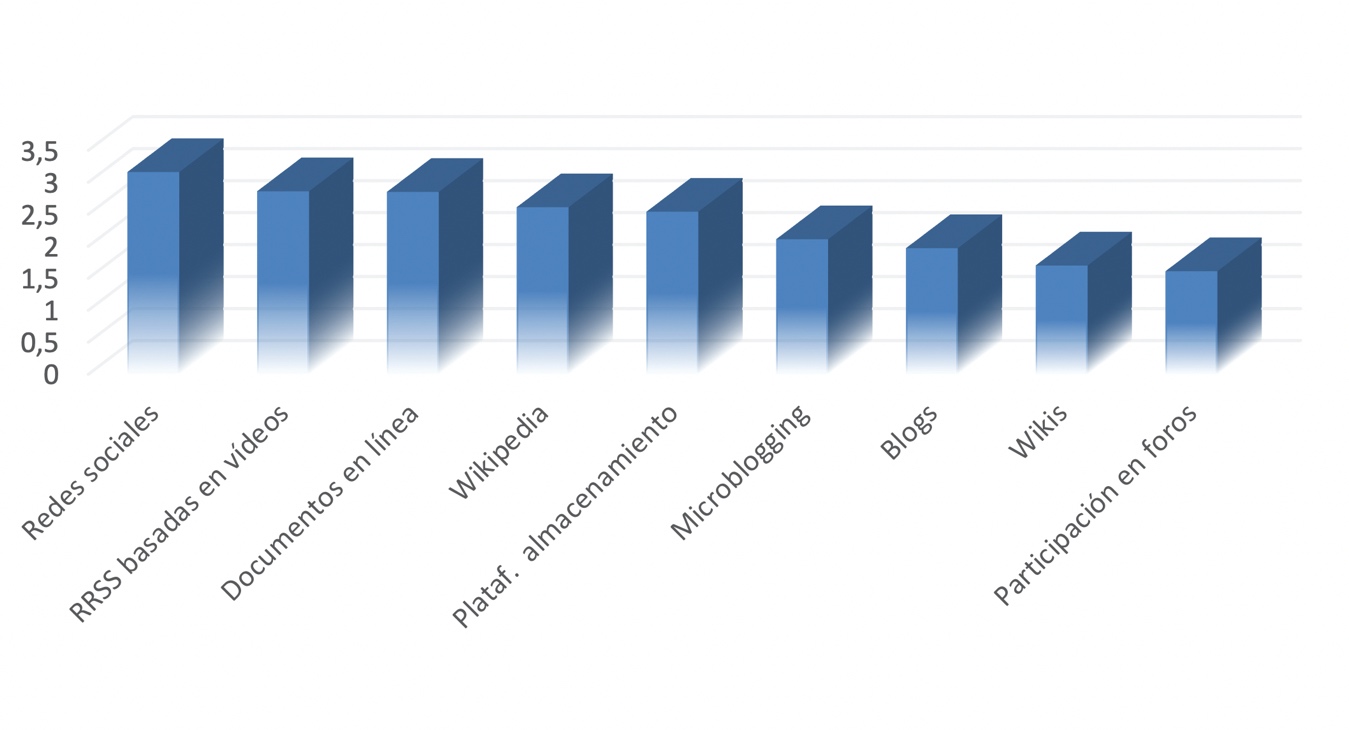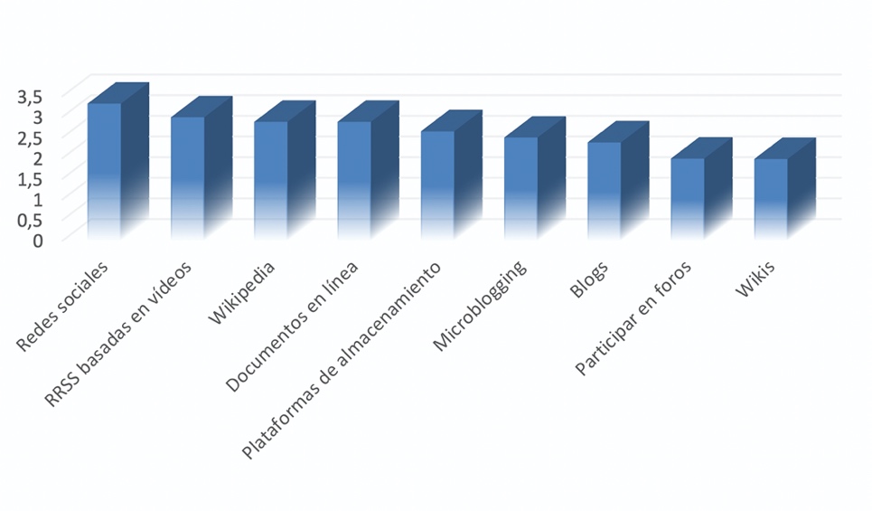 A partir de las respuestas obtenidas hemos observado que los alumnos universitarios en España utilizan muy frecuentemente las redes sociales como Facebook o Instagram, en concreto un 96,3% admitió usarlo poco, bastante o mucho. Las redes sociales basadas en vídeos como YouTube, los documentos en línea y la Wikipedia, también son muy usados, pero no así los blogs, wikis y foros. Esto puede ser debido a que los foros y los blogs han sido sustituidos por las redes sociales, en las que es posible opinar, comentar y seguir a otras personas de una manera más sencilla.