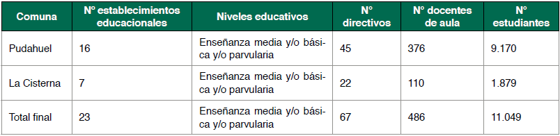 Esta fase consideró una población de 23 establecimientos educacionales municipalizados afiliados a las municipalidades de Pudahuel y La Cisterna, ubicados en el Área Metropolitana del país, dada la capacidad de acceso disponible. La muestra definitiva se determinó mediante un mecanismo probabilístico, con una población finita y baja, a la que se le administró un procedimiento aleatorio simple —de selección con tómbola— lo que derivó en una selección final de 22 establecimientos, de los cuales 15 correspondieron a la Municipalidad de Pudahuel y 7 a la Municipalidad de La Cisterna. La Tabla 1 describe y caracteriza los colegios municipalizados contemplados en la investigación.