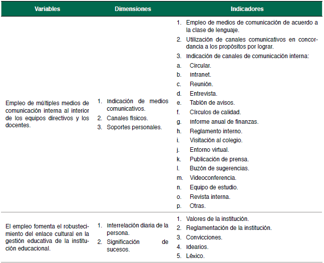 Resumen: La civilización actual está fomentando innovaciones importantes en la gestión de los colegios públicos, donde la comunicación constituye una ocupación estratégica. El artículo tiene por objetivo describir los medios de comunicación organizacional interna utilizados mutuamente por el equipo de directivos y profesores, y su influencia en el robustecimiento del enlace cultural y en la gestión de la organización educativa municipalizada de los distritos de La Cisterna y Pudahuel, Santiago, Chile. Se utilizó una óptica mixta de naturaleza exploratoria y descriptiva, aplicada en una muestra de 22 instituciones educacionales municipalizadas: para su fase cuantitativa se diseñó una encuesta que fue respondida por 246 personas; en su etapa cualitativa se utilizó una entrevista en profundidad aplicada a dos directores. Los resultados indican que los medios más utilizados por los participantes son las reuniones (91,0%) y las circulares (89,0%). Además, un (89,0%) declara la presencia de valores organizacionales participados por los equipos directivos y profesorado. Puede concluirse como tendencia el empleo de medios de comunicación existentes en el colegio, a saber, interrelación personal, escrito, audiovisual, telecomunicación e informática destinados a transmitir información según las finalidades a lograr al remitirla; y, la inclinación de participar un léxico, valores organizacionales y convicciones. Se espera que los resultados generen un conocimiento que posibilite caracterizar las prácticas comunicativas en las organizaciones educativas e incrementar el acervo cultural en la materia.