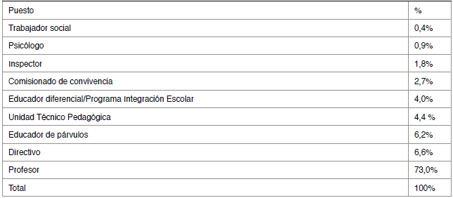 Tras la aplicación del instrumento a la muestra seleccionada de 22 establecimientos educacionales municipalizados, se recibieron 246 encuestas respondidas: 45 de ellas correspondientes a directivos (lo que representa el 67,0% del total de 67 integrantes de los equipos directivos, cifra señalada en la Tabla 1); y 201 pertenecientes al profesorado (es decir, el 41,0% del total de 486 miembros del cuerpo de profesores en la misma tabla). Por su parte, la Tabla 3 describe la distribución por puesto que ejercita de los informantes.