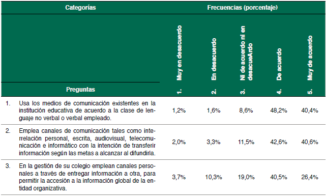 Se observa la aplicación de una estrategia comunicativa por los directivos dirigida al profesorado para promover la motivación, la unión y la transmisión de información mediante la utilización habitual de medios como reuniones, circulares, entrevistas, correo electrónico y memorándum, entre otros. Lo anterior coincide con Cuenca y Verazzi (2018), quienes indican que la comunicación interna comprende una serie de acciones comunicativas realizadas por una organización, centradas en la creación y conservación de adecuadas interacciones con y al interior de sus miembros, mediante la utilización de técnicas comunicativas para estar informados, unidos y motivados, contribuyendo simultáneamente al cumplimiento de los objetivos organizacionales.