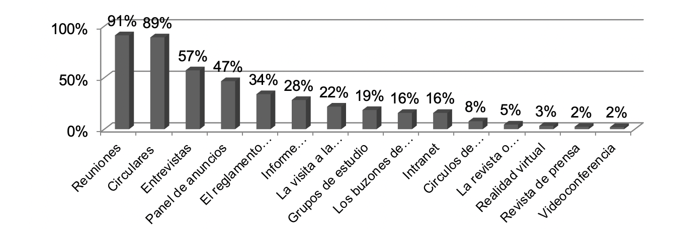 Al respecto, De Castro (2015) apunta medios de comunicación organizacional tales como reuniones, tablones de anuncios, periódico mural, correo electrónico y buzón de sugerencias, entre otros. Sin embargo, Macia (2019) explicita que los correos electrónicos y las plataformas digitales […] constituyen medios, cuyo empleo está extendido insuficientemente.