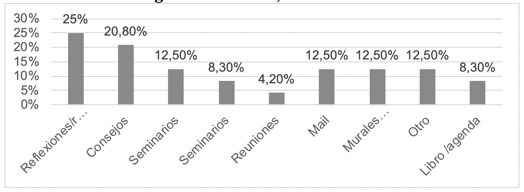 Ahora bien, en relación con la Figura 2, a pesar de la trascendencia de desarrollar la mejora de la calidad educativa, los participantes solo declararon realizar reflexiones pedagógicas (25,0%) y consejos (20,8%), lo que podría aludir a un trabajo colectivo del profesorado y los directivos, focalizado en temas administrativos, más que en gestión técnico-pedagógica.