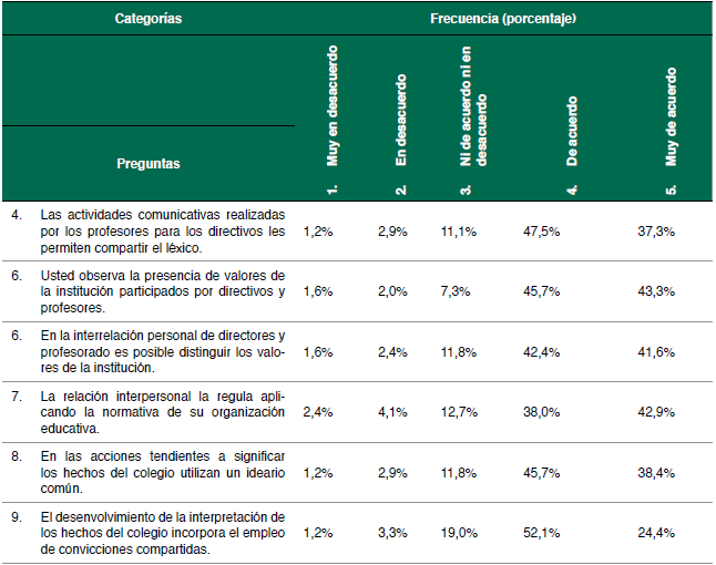 Ahora bien, desde el despliegue de la gestión escolar se valora en la organización educativa el componente de la cultura, pues corresponde a la suma de convicciones, valores y normas de comportamiento, participadas y no transcritas, que utilizan los integrantes de la misma para regir sus actuaciones y, en cuanto a ello, se expresan a través de estas (Apolo et al., 2017).