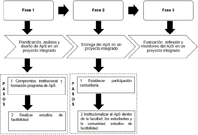 El trabajo de Pizarro et al. (2015) indica tres fases, donde la primera corresponde a la búsqueda de los socios comunitarios, luego viene la fase de implementación de la metodología donde se vincula al socio comunitario con los estudiantes, y se entrega el producto de asesoría y finalmente viene el monitoreo y evaluación. La diferencia con la propuesta presentada se encuentra en las fases y especificación de cada una de ellas, donde este artículo va una etapa anterior que corresponde al compromiso institucional y los estudios de factibilidad.