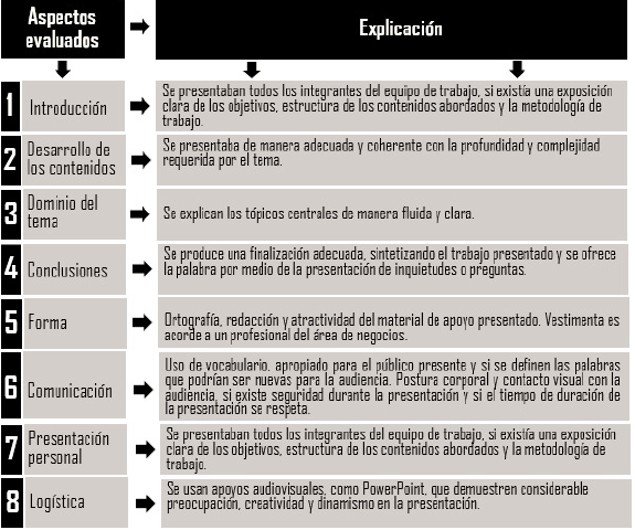 Se realizaron un total de cuatro presentaciones con entrega de informes escritos con los avances. Los aspectos evaluados pueden ser observados en la figura 2.
