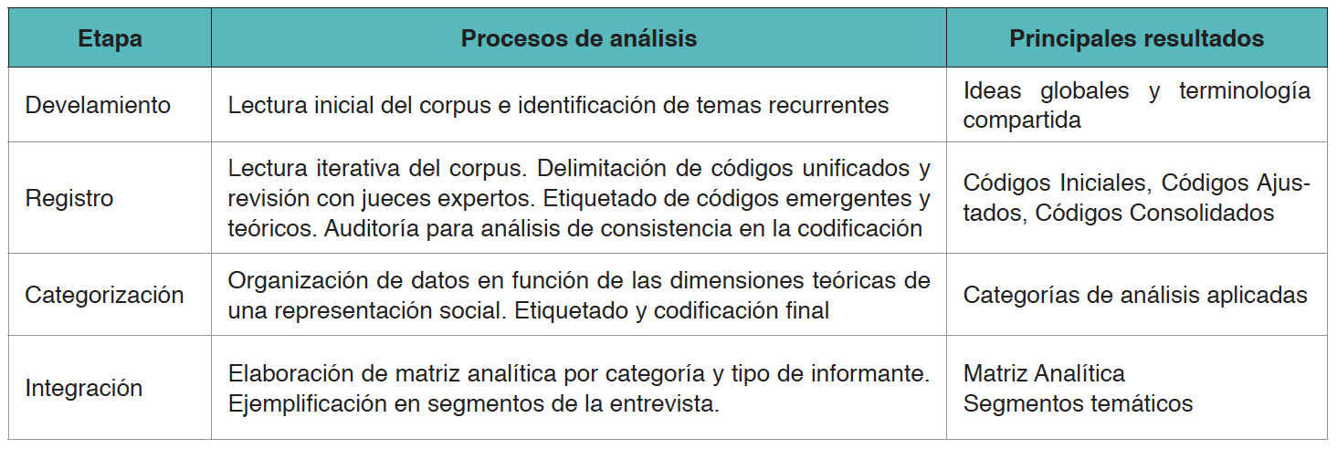 El análisis de contenido se realizó desde el enfoque procesual de las representaciones sociales, en distintas fases de trabajo, cuya nominación y sentido fueron adaptados de Cuevas (2016). A continuación, se describen las cuatro primeras etapas,[1] sus procesos de análisis y principales resultados:
