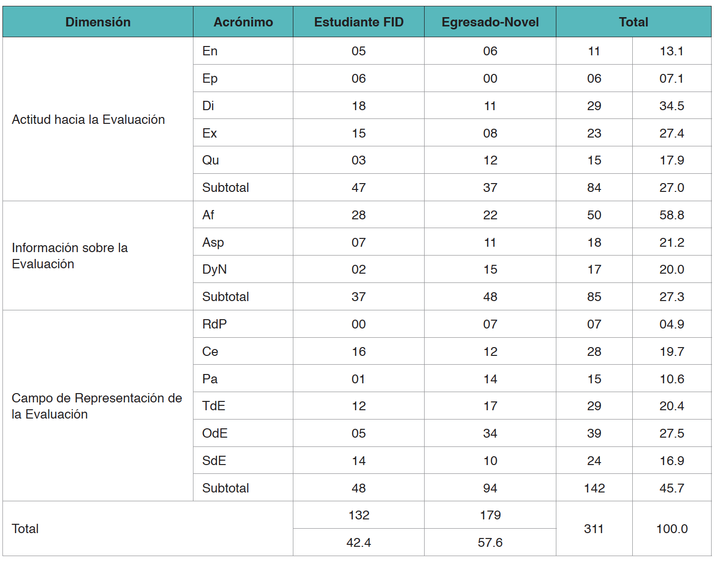 El análisis de datos numéricos demostró que gran parte de los segmentos de las entrevistas se concentró en la dimensión Campo de Representación, con un 45.7 % de las frecuencias observadas. Le siguen las dimensiones Información sobre la Evaluación y Actitud hacia la Evaluación, con menores casos. La mayoría de estos provienen de Egresado/Novel, excepto en la dimensión actitudinal donde resalta la cantidad de observaciones de Estudiante FID. Así se constata que, a nivel grupal, los focos temáticos de los segmentos diferían entre los distintos tipos de participantes. Esto se relaciona con la premisa de que es posible prever ciertos dinamismos en el contenido de la representación de la evaluación a medida que avanzan en la trayectoria formativa, lo que coindice con estudios previos (Mendes & Rinaldi, 2019; Jiang et al., 2020).
