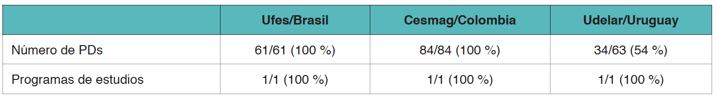 Para la recolección de datos, se contactó con las Instituciones de Enseñanza Superior (IES) solicitando los programas de estudios (PE) que orientan los cursos de formación de profesores en EF y los planes de todas las disciplinas que conforman el currículo de estos cursos. La composición de las fuentes está relacionada con los documentos puestos a disposición por cada institución como se muestra en la Tabla 1. Los PDs y PE de los cursos corresponden a los años 2014 (Ufes/Brasil) y 2017 (Cesmag/Colombia y Udelar/Uruguay) que al momento de la recopilación de datos (julio 2020) todavía estaban en marcha.