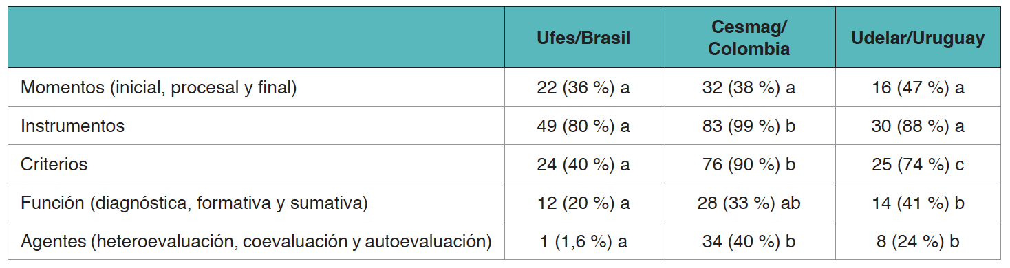 La principal preocupación de Ufes/Brasil, en general, es presentar los instrumentos de evaluación que se utilizarán durante el semestre académico. Cesmag/Colombia y Udelar/Uruguay, además de los instrumentos, también destacaron la prescripción de los criterios. Los momentos, funciones y agentes aparecieron en menor proporción en los PDs de los tres cursos.