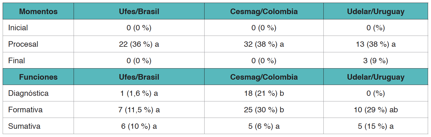 La función formativa fue más destacada en todos los tres cursos. Existen diferencias estadísticamente significativas entre Ufes/Brasil y Cesmag/Colombia cuando analizamos las funciones diagnóstica y formativa. Las disciplinas de Cesmag/Colombia están más preocupadas por asumir la evaluación diagnóstica y formativa en comparación con la Ufes/Brasil. No se identificaron diferencias estadísticamente significativas entre las IES, con respecto a la función