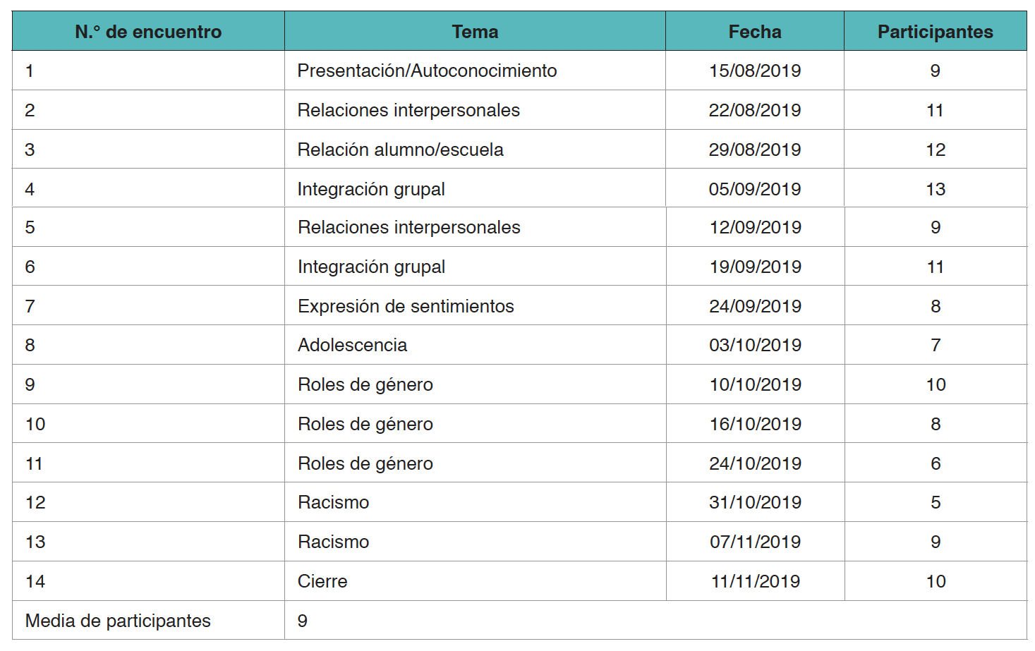 En total, 15 adolescentes permanecieron en el grupo de reflexión. De acuerdo con la Tabla 2, referida a los 14 encuentros y temas trabajados, realizados en agosto y noviembre de 2019, se obtuvo un promedio de nueve participantes por encuentro.