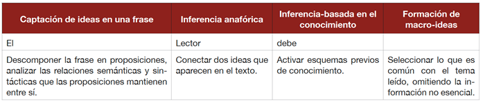 Una serie de procesos cognitivos que implican formar y conectar proposiciones dentro de una frase, realizar inferencias tanto las que conectan elementos textuales como las basadas en el conocimiento y formar macro-ideas o estructuras de integración de la información. (p. 321)