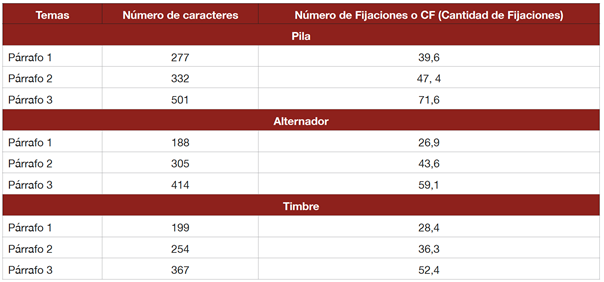 Se tuvo en cuenta el número de caracteres versus el número de fijaciones en los procesos de comprensión lectora, los cuales se convirtieron en unos criterios que permitieron con la ayuda del software Tobii 3.4.6 identificar si los escolares leyeron por menos de lo esperado (es decir por debajo de la cantidad de fijaciones establecida en la tabla 2), sobreleyeron (por encima de la cantidad de fijaciones establecida en la tabla 2), realizaron lecturas incompletas, no leyeron los textos relacionados con la pila, el alternador y el timbre; y cómo se convirtieron en un referente para comprobar los resultados obtenidos en el TPC.