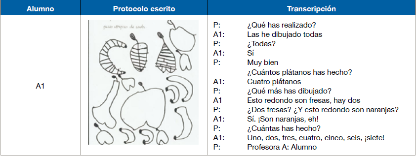 A continuación, en la figura 5 se presenta un ejemplo de respuesta en el que se combinan representaciones. En las representaciones propuestas por A4 y A12, se puede constatar que los niños reconocen que el todo (15 frutas) se puede separar en conjuntos discretos de varios elementos (p. ej. plátanos, naranjas, manzanas y peras), que pueden tener (o no) diferente cardinal (p. ej. 5, 4, 3, 3 o 5, 4, 3, 2, 1).