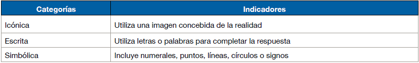 Cabe mencionar que las respuestas de los niños a determinada tarea matemática que implica la producción de representaciones pueden clasificarse en varias de estas categorías, no necesariamente en una exclusivamente.