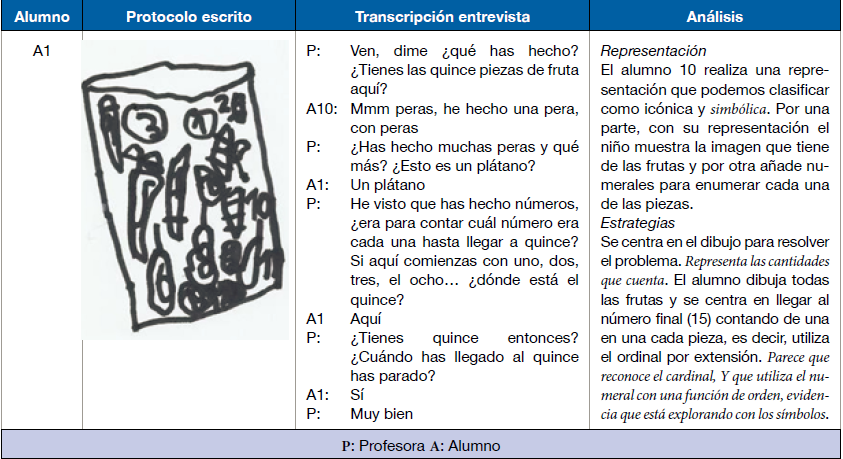 En cuanto a los métodos utilizados por los niños para resolver el problema según las dimensiones planteadas por Carruthers y Worthington (2006) se observó que 19 de las propuestas de solución de los niños se clasifican en la categoría conteo continuo y cuatro en la de separación de conjuntos. En el primer caso se clasifican aquellas representaciones que expresan una cantidad. Los niños representan y cuentan cosas que eligen (en este caso frutas) pero que no ven físicamente (p. ej. A1, ver figura 4). Normalmente este tipo de representaciones se dibujan en una disposición lineal horizontal (p. ej. A2, ver figura 4), aunque se pueden encontrar otras disposiciones. Se considera que es el primer paso para la exploración del cálculo. En nuestro caso la mayoría de los niños se centraron más, en el objetivo de tener 15 piezas de fruta, que en el orden al elegir qué tipo fruta dibujar. Si nos fijamos en la solución dada por A10 (figura 3) el número final de su recuento representa el total. Estas diferentes prácticas matemáticas relativas al conteo continuo son clave para reconocer las estrategias que los niños están desarrollando al sumar (Carruthers y Worthington, 2006). Así, algunos niños, como se constató en las entrevistas, contaban continuamente, empezando por una de las frutas, la que ellos consideraban “la primera”. Casi todos los niños entienden que es necesario contar todo para llegar a un total, excepto aquellos que no lograron resolver de forma adecuada el problema (p. ej. A14, A16-figura 4).