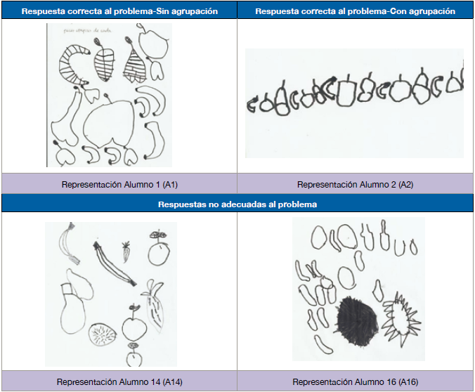 En cuanto al tipo de representaciones encontramos que los 23 alumnos que participan en el estudio utilizan representaciones icónicas. Al usar este tipo de representación los niños se apoyan en el dibujo para realizar el conteo y controlar la cantidad total definida en el problema propuesto. Sus dibujos indican a la vez, el tipo de frutas elegidas por los niños, la cantidad que han considerado para cada tipo y en algunos casos la intencionalidad de hacer agrupaciones (reparticiones). Cabe mencionar que, aunque todos proponen una representación icónica no todos resuelven de manera adecuada el problema, es el caso de cinco de los niños. En la figura 4 se muestran diferentes ejemplos de respuestas, donde se evidencian los aspectos antes señalados.