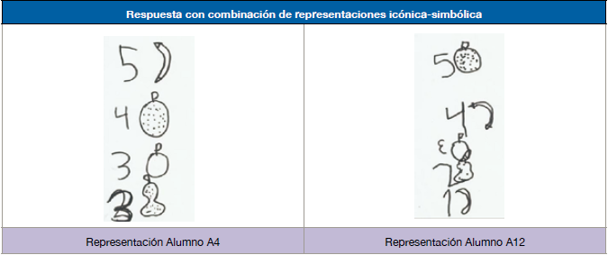 Los niños que realizan representaciones que combinan lo icónico y simbólico, son aquellos que también utilizan estrategias de exploración de símbolos, evidenciando un razonamiento más complejo. Pasar a otro tipo de estrategias, como la realización de operaciones simbólicas estándar con números pequeños, requiere que los niños las hayan desarrollado previamente. Aunque cabe precisar, como plantean Vanegas y Giménez (2018) que cuando los niños resuelven problemas lo importante no es el paso de una estrategia a otra sino el uso de estrategias apropiadas que muestran una interpretación cada vez más completa y adecuada del problema.