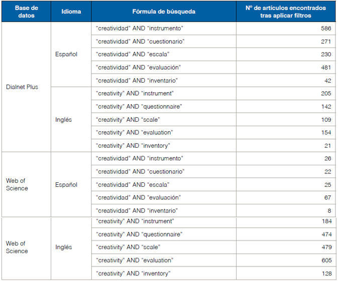 Para dar comienzo a esta revisión sistemática, en primer lugar, se ha llevado a cabo una consulta tanto en las bases de datos de Dialnet Plus y Web of Science como en el buscador de Google Académico. Para ello, se han tenido en cuenta los descriptores “creatividad” e “instrumento”, así como, otras palabras sinónimas a esta última como “cuestionario”, “escala”, “evaluación” e “inventario”. Los operadores booleanos que se han utilizado en las fórmulas de búsqueda han sido AND y el uso de comillas (“”). Por tanto, la búsqueda ha estado establecida mediante las siguientes fórmulas de búsqueda: “creatividad” AND “instrumento”; “creatividad” AND “cuestionario”; “creatividad” AND “escala”; “creatividad” AND “evaluación”; “creatividad” AND “inventario”. Un aspecto por destacar es que dichas búsquedas se han realizado tanto en español como en inglés. Además, se han tenido en cuenta una serie de filtros como el tipo de documento, idioma, disponibilidad del texto y año de publicación. La tabla 1 muestra los diferentes resultados obtenidos en las bases de datos consultadas según cada fórmula de búsqueda.