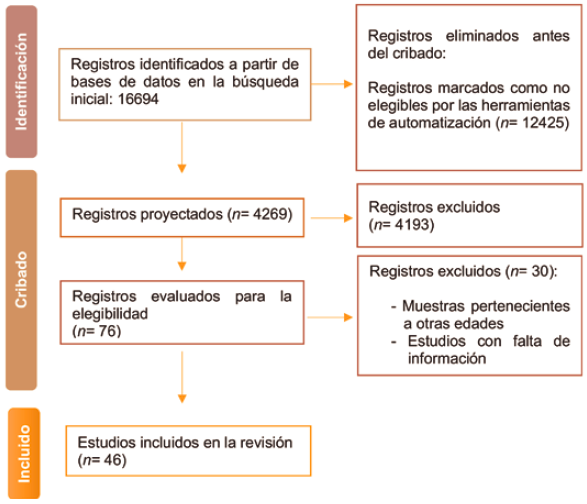 Con base a estos criterios se seleccionaron un total de 46 artículos para su posterior análisis en el siguiente apartado de esta revisión sistemática. Mediante la búsqueda inicial a partir de las diferentes fórmulas de búsqueda indicadas anteriormente se han obtenido un total de 16 694 resultados. A esta primera búsqueda se le aplicaron los filtros pertenecientes a las bases de datos obteniendo así 4269 y, más adelante, se aplicaron los criterios de inclusión y exclusión dando lugar a 76 estudios. Dichos estudios se examinaron manualmente y se seleccionaron 46 artículos. Todo este proceso puede verse en la figura 1.