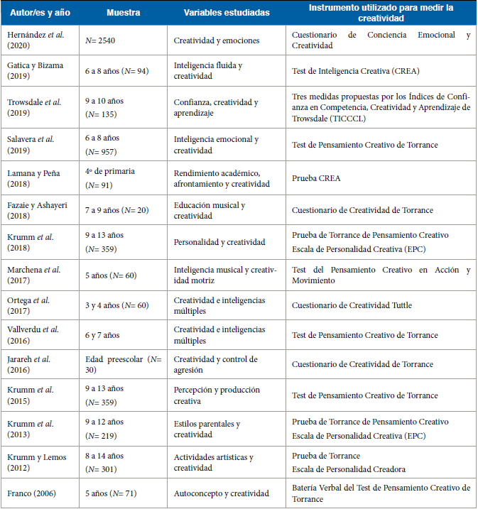 La tabla 2 muestra las ideas principales de los artículos enfocados en estudiantes tanto de infantil como de primaria. Las variables más estudiadas a estas edades en relación con la creatividad son la inteligencia (Gatica y Bizama, 2019; Ortega et al., 2017; Salavera et al., 2019; Vallverdú et al., 2016) y aspectos relacionados con el arte y la música (Fazaie y Ashayeri, 2018; Krumm y Lemos, 2012; Marchena et al., 2017). Otras variables también estudiadas a dichas edades son las emociones (Hernández et al., 2020), confianza y aprendizaje (Trowsdale et al., 2019), rendimiento académico (Lamana y Peña, 2018), personalidad (Krumm et al., 2018), control de agresión (Jarareh et al., 2016), percepción y producción creativa (Krumm et al., 2015), estilos parentales (Krumm et al., 2013) y autoconcepto (Franco, 2006).