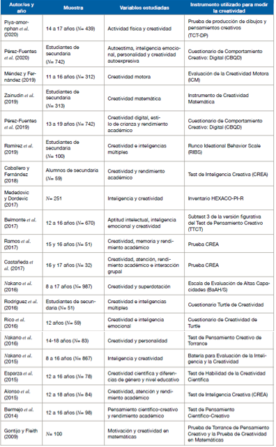 La tabla 3 se refiere a los estudios sobre la creatividad orientados a estudiantes de educación secundaria. Esta tabla muestra cuáles son las variables más comunes relacionadas con la creatividad en estas edades.