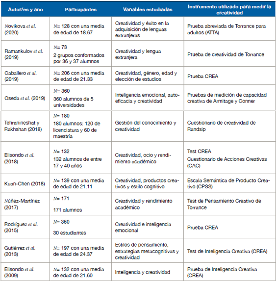 Cada uno de estos estudios revela la importancia que tiene la creatividad dentro del contexto educativo sin distinción de la edad o la etapa educativa en la que se encuentre el alumnado; ya que mediante ciertas estrategias relacionadas con la creatividad se pueden potenciar habilidades para desarrollar jóvenes activos y capaces de tomar decisiones o resolver los problemas que se les planteen por sí solos (Canelo et al., 2015; Casado y Checa, 2020). Algunos de estos recursos a tener en cuenta son los instrumentos existentes para identificar esta capacidad como el Test CREA (Corbalán et al., 2003).