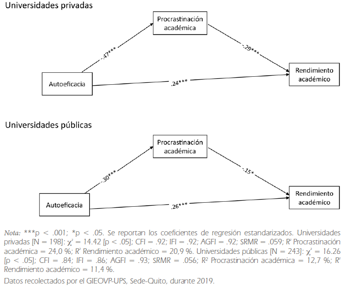 Abstract: The study of non-cognitive factors that influence academic success has become a topic of growing interest in educational research. In this framework, the present study aims to examine the relationship between university academic performance and two specific non-cognitive factors: self-efficacy and academic procrastination. Similarly, the mediating role that academic procrastination plays in the relationship between self-efficacy and academic performance is explored. The quantitative study was conducted in the Ecuadorian context and was based on a sample of 788 students enrolled in public and private universities in the Metropolitan District of Quito. The analytical strategy consisted on the formulation of path models, based on the methodology of structural equations. The main results of empirical analysis are: a) both self-efficacy and academic procrastination directly affect the academic performance of university students; b) self-efficacy is indirectly related to academic performance through academic procrastination; c) these non-cognitive factors are more determinant for student performance in the early career stage, especially in the case of private universities. Finally, the implications of the findings are discussed, considering the potential development of strategies to promote academic success through interventions that favor the students' sense of self-efficacy and self-regulation.