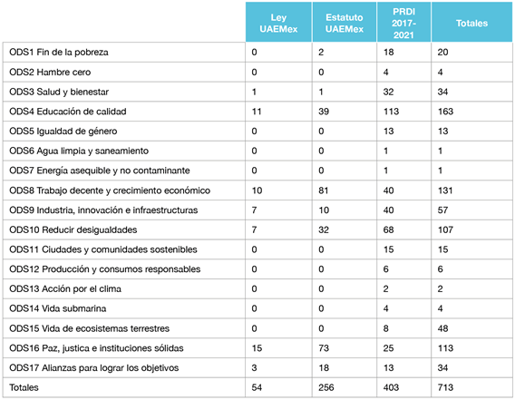 La Ley UAEMex fue actualizada en 2005, el Estatuto UAEMex en 2007, y el PRDI en 2017; se obtuvo que los ODS que aparecen con mayor frecuencia son el objetivo vinculado con la educación (ODS 4) con 161 co-ocurrencias, en segundo lugar, el objetivo de trabajo decente (ODS 8) con 131 co-ocurrencias y tercero al objetivo de paz, justicia e instituciones sólidas (ODS16) con 113 co-ocurrencias.