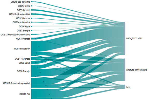 En el Diagrama de Sankey (figura 1) se observa que el PRDI tiene más menciones sobre ODS que la Ley y el Estatuto; sin embargo, en estos dos últimos documentos son casi de la misma proporción que el PRDI, son documentos con menos páginas y mayor lapso de actualización.
