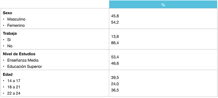 En términos sociodemográficos, la muestra de estudios evidencia un predominio de estudiantes mujeres (54,2 %), adolescentes entre 14 y 17 años (39,5 %), mayoritariamente pertenecientes a enseñanza media (53,4 %) y donde solo un porcentaje marginal compatibiliza sus estudios con alguna actividad laboral (13,6 %).