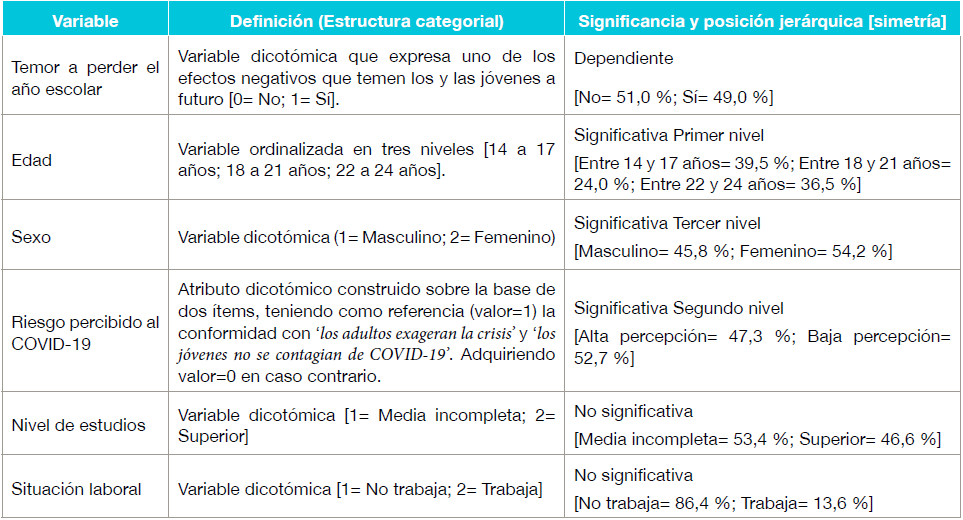 En primer lugar, se efectúa un análisis descriptivo mediante el cálculo de proporciones de las variables categóricas, sean estas de métrica nominal u ordinal; información que es representada a través de Tablas. En esta fase se modelan las percepciones que tienen los y las estudiantes respecto de la gravedad atribuida a la crisis Covid-19, las incertidumbres y sentimientos que les provoca, así como las consecuencias negativas que el confinamiento les genera en su cotidianidad, análisis que son segmentados sobre la base de atributos clasificatorios considerados significativos, como la edad y el sexo.