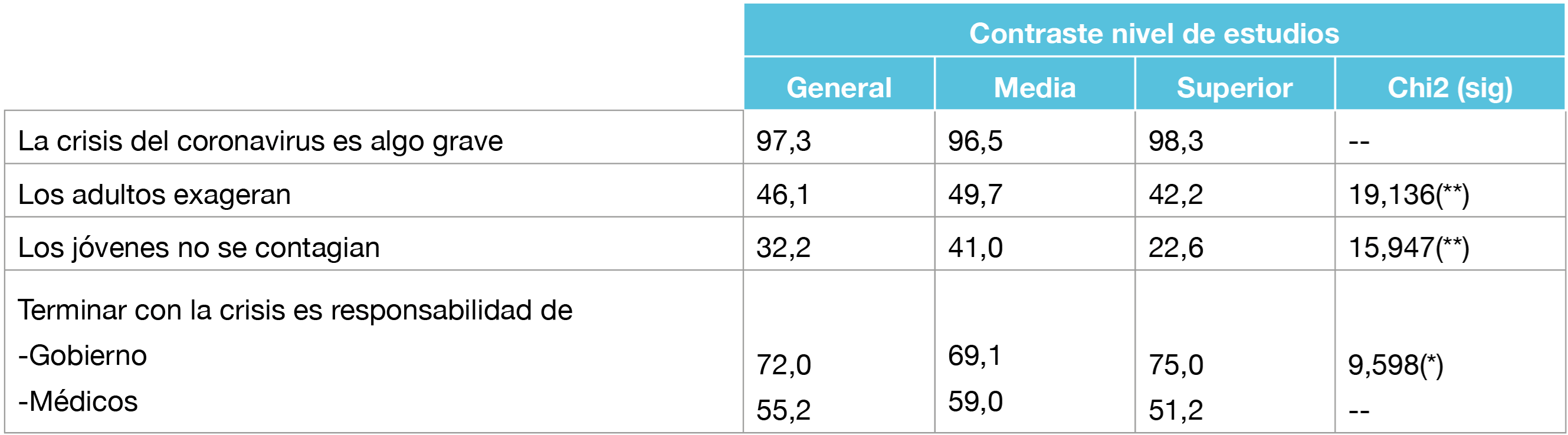 Para el caso de los y las jóvenes, la situación de pandemia en los últimos meses ha implicado una serie de modificaciones en su estilo de vida, comportamientos y expectativas, especialmente entre quienes están estudiando, dado el abrupto cambio que ha significado migrar desde una modalidad presencial a una modalidad online o a distancia. A este respecto, la tabla 3 expone que prácticamente la totalidad de los estudiantes (97,3 %) reconoce que la crisis por coronavirus es grave, no encontrándose diferencias significativas entre grupos. A pesar de reconocer esta gravedad, un 46,1 % piensa que los adultos exageran y 32,2 % afirma que normalmente los jóvenes no se contagian, cifras que son particularmente elevadas entre estudiantes de Enseñanza Media, observándose diferencias estadísticamente significativas en el contraste de hipótesis (p<0,01). En términos generales, un 55,2 % señala estar de acuerdo en que terminar con la crisis es responsabilidad de los médicos y un 72,0 % atribuye igual responsabilidad al Gobierno, proporción particularmente elevada entre estudiantes de Educación Superior [chi2=9,598; p<0,05].