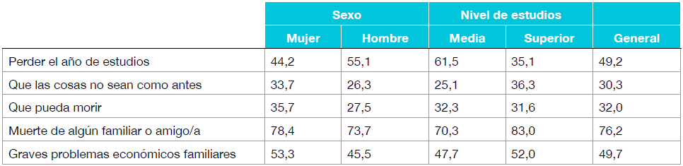 A pesar del sentido de invulnerabilidad relatada anteriormente, los y las jóvenes son conscientes del peligro que representa la Covid-19 para la salud, la vida y el bienestar económico y emocional de ellos mismos y de su entorno significativo, donde el temor a la muerte, especialmente de un familiar o amigo, es una idea omnipresente, particularmente en estudiantes mujeres y que cursan estudios superiores; asimismo, pervive la preocupación que las cosas no vuelvan a ser como antes en aproximadamente un tercio de la población estudiantil. La propagación del COVID-19 ha derivado en graves impactos económicos para el hogar y significado una amenaza a la salud, cuya peligrosidad ha nutrido un conjunto de sentimientos negativos entre los que destaca el temor a la muerte, algunos de los cuales seguramente continuarán tras la superación de esta crisis.