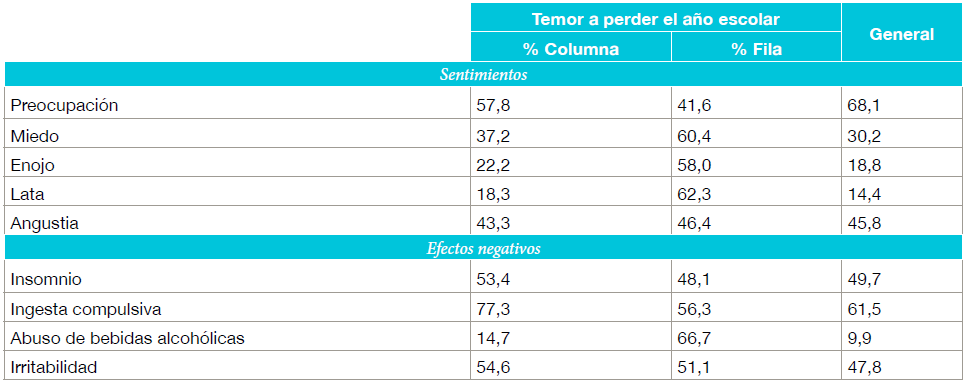 Por otro lado, entre los efectos negativos que los y las estudiantes atribuyen a la crisis, destacan la ingesta compulsiva (61,5 %), el insomnio (49,7 %) y la irritabilidad (47,8 %). Cifras que adquieren mayor preponderancia entre quienes temen perder el año escolar, particularmente en lo que sobrealimentación o comer en exceso refiere (77,3 %). En el sentido opuesto, entre quienes declaran abuso de bebidas alcohólicas e ingesta compulsiva es donde encontramos mayor temor a perder el año escolar (66,7 % y 56,3 % respectivamente), con diferencias estadísticamente significativas respecto de quienes no manifiestan dichas conductas.