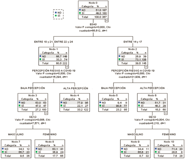 En un segundo nivel de segmentación y para ambos nodos precedentes, irrumpe la variable Percepción de riesgo a Covid-19, según la intensidad que declaren. Para el caso de los adolescentes (Nodo 2) la Percepción de riesgo discrimina significativamente [x2=31,939; p=0,00], de modo que la incertidumbre aumenta en estudiantes que manifiestan baja percepción de la gravedad del COVID-19 (90,6 %; Nodo 5). Por su parte, quienes manifiestan menor incertidumbre por perder el año lectivo son los jóvenes con alta percepción de riesgo (Nodo 4) mayores de 17 años (22,1 %).