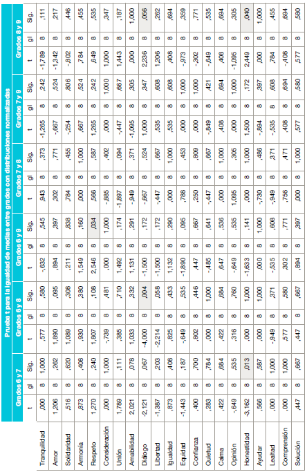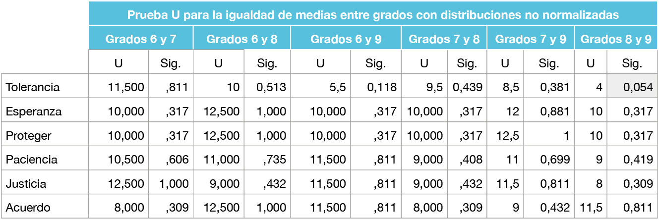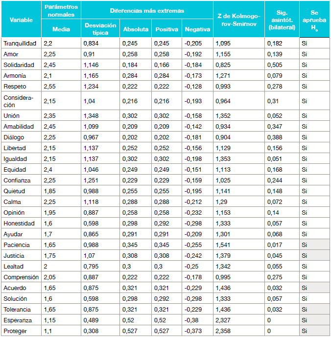 El Test de Kolmogorov-Smirnov para las variables permite rechazar o no la H0. En la mayoría de los casos no se rechaza la hipótesis, pero en los casos de las variables Paciencia, Justicia, Acuerdo, Tolerancia, Esperanza, Proteger si se rechaza. Esto quiere decir que estas variables mencionadas proceden de conjuntos de datos con distribuciones no normalizadas. Se encontró una diferencia significativa en la frecuencia de algunos conceptos como respeto, diálogo, honestidad y tolerancia. Cuando comparamos el grado 6 con el grado 9 encontramos una diferencia significativa al utilizar el concepto de respeto como sinónimo de paz. Igual sucede para el concepto de diálogo cuando comparamos los grados 6 con 8 y 8 con 9. El concepto de honestidad demuestra diferencias significativas cuando comparamos los grados 6 con 7 y 8 con 9. Por último, el concepto de tolerancia demuestra diferencias significativas cuando comparamos los grados 8 y 9. La tabla 1 muestra los resultados del Test de bondad de ajuste Kolmogorov-Smirnov: