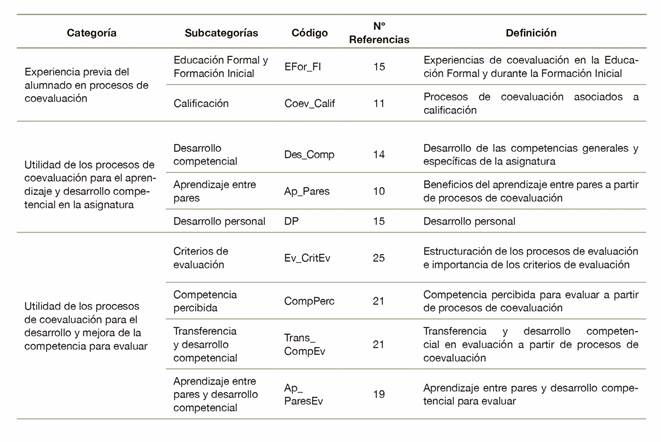 Para analizar la información recopilada, comenzamos con las transcripciones de las grabaciones de las entrevistas. Posteriormente, se siguió un proceso de codificación inductiva. Se elaboró una lista de códigos en función de los temas de la investigación y de la información obtenida de la lectura detallada de la transcripción de las diez entrevistas. Este paso permitió una visión detallada de la información recogida, que posteriormente se analizó. Este se desarrolló sobre una base cualitativa de codificación y categorización de la información. Las frases se tomaron como unidades de codificación. Inmediatamente después, la información se organizó mediante un sistema de codificación abierta, estableciendo los códigos en categorías y subtemas (Vaismoradi et al., 2013). Emergieron nueve subcategorías que se engloban en tres grandes categorías. La primera categoría hace referencia a la experiencia previa del alumnado con procesos de coevaluación e incluye dos subcategorías: (i) Educación formal y formación inicial; y (ii) calificación. La segunda categoría hace referencia a la utilidad de los procesos de coevaluación para mejorar los aprendizajes, englobándose en esta categoría: (i) desarrollo competencial; (ii) aprendizaje entre pares; y (iii) desarrollo personal. Por último, nos encontramos con la utilidad de los procesos de coevaluación para mejorar la propia competencia evaluadora, dividiéndose esta categoría en: (i) criterios de evaluación; (ii) competencia percibida; (iii) transferencia; y (iv) aprendizaje entre pares para el desarrollo de la competencia evaluadora. La tabla 1 muestra la estructura final del análisis tras este proceso y el número de referencias en cada una de ellas.