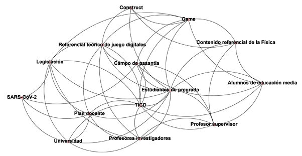 Nota. Elaborado por el autor con el software Gephi.La figura 2 representa los actantes que conforman la red sociomaterial estudiada e, inicialmente, cabe destacar el Síndrome Respiratorio Agudo Severo Coronavirus 2 (‘SARS-CoV-2’), cuya presencia y campo de acción afectó profundamente la vida cotidiana de la universidad. En red, el coronavirus impuso un procedimiento de distanciamiento social en las prácticas de docencia, investigación, extensión y administración por sus formas transmisivas e implicaciones de letalidad por el COVID-19. Desde sus agenciamientos, el SARS-CoV-2 obligó a la universidad a reelaborar su normativa y plasmarla a través de ‘legislación’. La respuesta a esta gama de efectos fue el establecimiento de un régimen de Educación Remota de Emergencia (ERE) mediado por Tecnologías de la Información y la Comunicación Digital (“TICD”). Esto también requirió adaptaciones al ‘plan docente’ de la pasantía curricular y cambió las interacciones entre: ‘docentes-investigadores’ (el autor de este artículo y un supervisor de investigación), ‘graduandos/estudiantes de pregrado’, ‘docente-supervisor de prácticas’, ‘estudiantes de secundaria’ y prácticas en el ‘campo de pasantía’. Como una de las entidades asociadas a la red investigada y en cumplimiento de los estándares ERE, realicé conversaciones pedagógicas con los estudiantes cubriendo el ‘marco teórico de los juegos digitales’ y sus implicaciones educativas. Este conjunto de esfuerzos incluyó clases teóricas, momentos de planificación y la creación de un ‘game’ por parte del grupo de docentes en formación en la plataforma ‘Construct’. La pasantía curricular estuvo acompañada por un docente supervisor que señaló la Electrostática como ‘contenido referencial en Física’ para ser explorado pedagógicamente con el game con sus alumnos de secundaria.