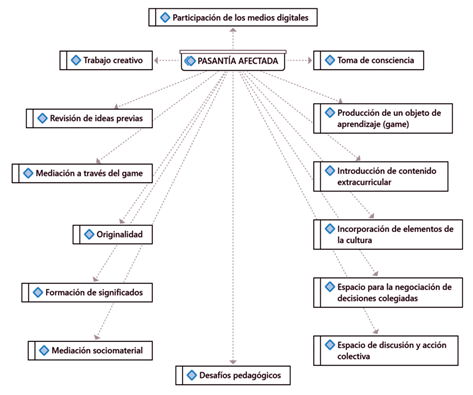 Un último realce de los resultados de los procedimientos metodológicos realizados con el corpus destaca aspectos que formaron parte de la realidad pedagógica producida por el colectivo híbrido durante la pasantía curricular, afectándolo (figura 4).