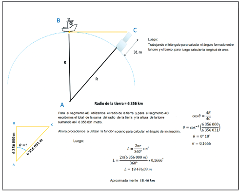 El barco, para divisar por primera vez el faro, debe encontrarse a una distancia de la base del faro igual a la altura del mismo, para que la línea de visión del observador, al divisar el faro, forme con la horizontal un ángulo de 45º, teniendo en cuenta la curvatura del planeta. (Problema La Luz de Boston; Producción G2.P09)