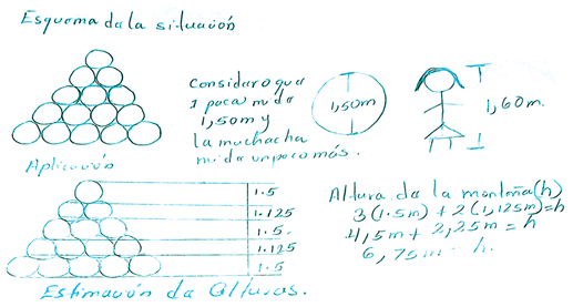 El segundo procedimiento de resolución identificado corresponde a aquellas producciones donde los profesores participantes desarrollaron las fases modelo real → modelo matemático. En estas producciones se consideró como suficiente formular un modelo matemático para resolver el problema, sin siquiera trabajar matemáticamente con el mismo; en otras palabras, se matematizó el problema para darle respuesta. Se tiene el siguiente ejemplo del PR2 para el Problema Meandros en la figura 2: