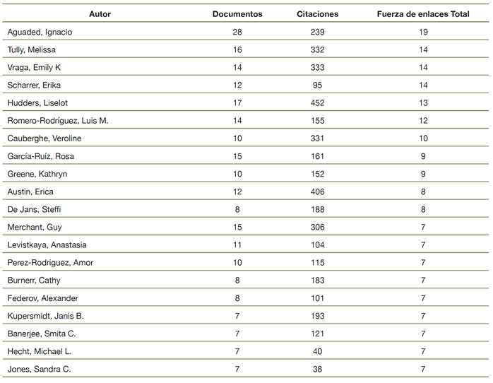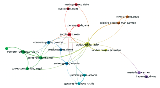 Se destaca que entre los 20 autores con mayor cantidad de documentos, citaciones y coautorías se encuentran prestigiosos investigadores de España, como es el caso de Ignacio Aguaded (1); Luis Miguel Romero Rodríguez (6); Rosa García Ruiz (8); Amor Pérez Rodríguez (14). La cantidad de citas, documentos y relación de enlaces de coautoría se muestran en la tabla 1.