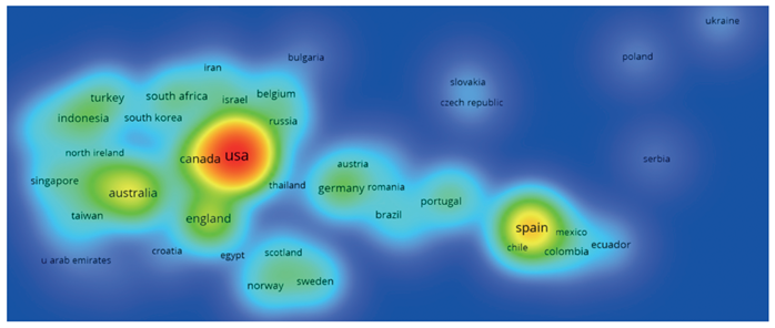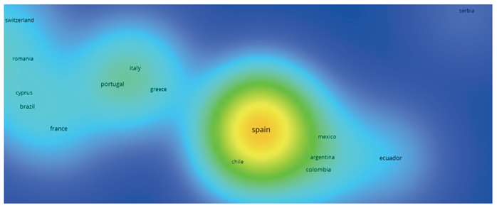 Nota. El autor a partir de VOSviewer.Al revisar el contexto iberoamericano, se profundiza el análisis en la cabecera de Clúster “España”, se observa que se generan redes bibliométricas con países como Chile, México, Argentina, Colombia, Ecuador, Grecia, Italia, Portugal, Francia y Brasil. La figura 3 muestra la densidad de la relación que se da entre los países mencionados, existiendo mayor producción científica cuando más cerca de la cabera de clúster se ubica el país.