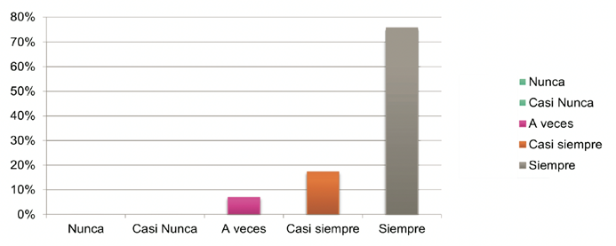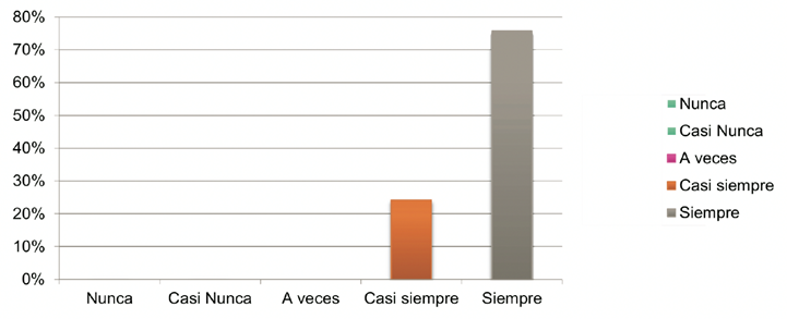 El gráfico 1 muestra que el 76 % del profesorado encuestado en centros JEE del nivel inicial, primario y secundario, (caso 1, 2, 3) respondieron que “siempre” desarrollan competencias en sus estudiantes, mientras que el otro 24 % respondió “casi siempre”; no obstante, en la entrevista y observación, la mayoría no evidenciaron uso de estrategias para el desarrollo de las competencias; expresan: “no disponemos de estrategias para dar respuesta a los estudiantes (…) (003 ,014), el MINERD debe capacitándonos para cumplir con los objetivo de la educación (005, 017, 021), hay que invertir más en nuestra formación (008, 015)”. Las respuestas reflejan la necesidad de desarrollar las competencias que permita la aplicación del currículo vigente, donde la innovación es un eje transversal.