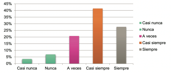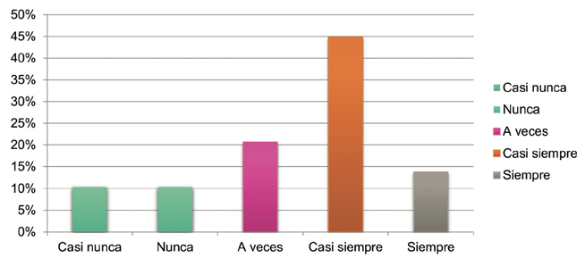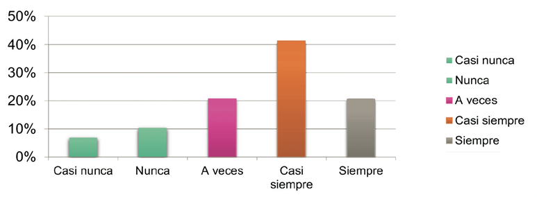 Los resultados del gráfico 3 muestran que el 7 % del docente encuestado respondió, “casi nunca” la formación recibida le sirve para dar respuesta a las necesidades educativas del estudiante, el 10 % “nunca”, el 21 % “a veces”, 41 % “casi siempre”, 21 % “siempre”; se muestra que la mayoría está preparada para desarrollar procesos educativos de calidad, sin embargo, al triangular los resultados, un alto porcentaje del profesorado presenta debilidad en su formación para responder a procesos creativos e innovadores, afirman: “El MINERD debe capacitarnos para atender de forma innovadora y creativa la diversidad del aula (02, 05), Lo recibido en las universidades no es suficiente, necesitamos formación y capacitación para desarrollar buenas prácticas áulicas (010, 015, 019)”. La voz del docente evidencia la necesidad de formación para superar el desfase pedagógico, didáctico, metodológico y tecnológico en la formación del docente.