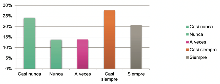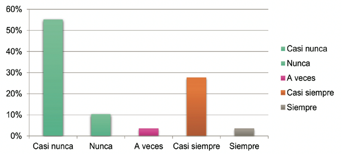Respecto a la formación en uso de estrategias innovadoras para valorar positivamente la diversidad; según el gráfico 4, el 45 % respondió, “casi siempre” es suficiente, el 21 % “a veces”, 14 % “siempre”, 10 % “nunca” y 10 % “casi nunca”, no obstante, preocupan los resultados de la entrevista y la observación donde un alto porcentaje presentan dificultad en el uso de estrategias activas e innovadoras y expresan: “tenemos debilidad en el uso de estrategias activas (007, 0014, 0021), en los talleres de capacitación no se tratan esas estrategias, pues, lo imparten personas que saben menos que uno (…) (008, 012, 021)”. Se muestra la necesidad de formación del docente sobre la base de un enfoque innovador que posibiliten acciones educativas para responder a las necesidades de los estudiantes.